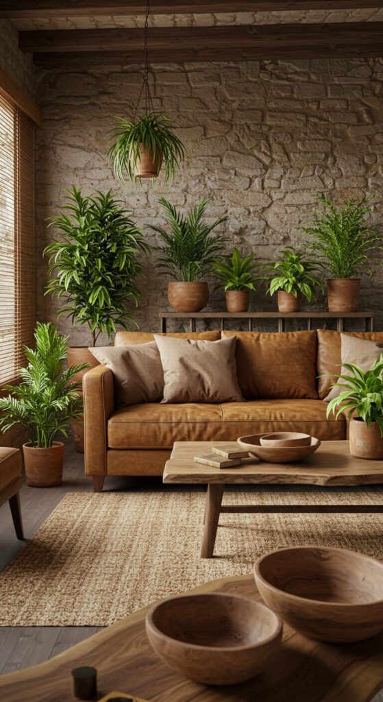 Earthy tones envelop a brown couch with natural materials and plants for a grounding, serene escape.