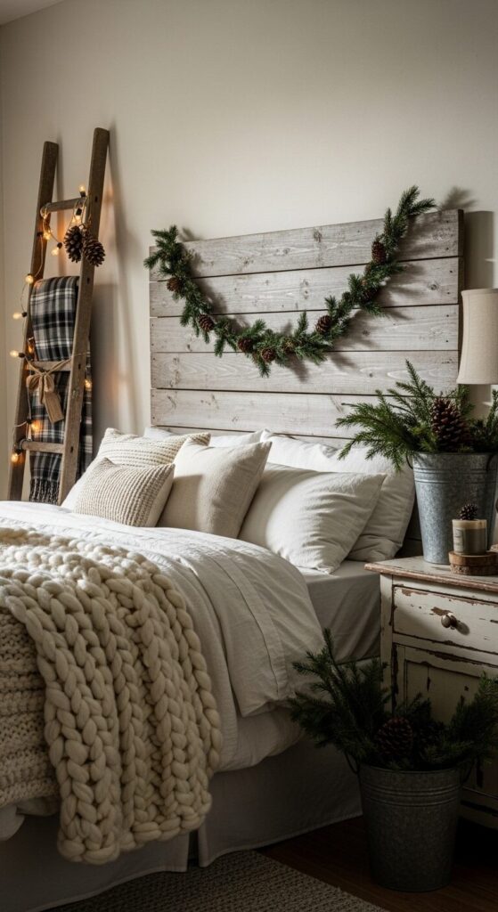Envision weathered wood tones mixing with soft whites and touches of evergreen. A reclaimed wood headboard serves as the focal point, dressed with a simple pine garland and natural burlap ribbon.