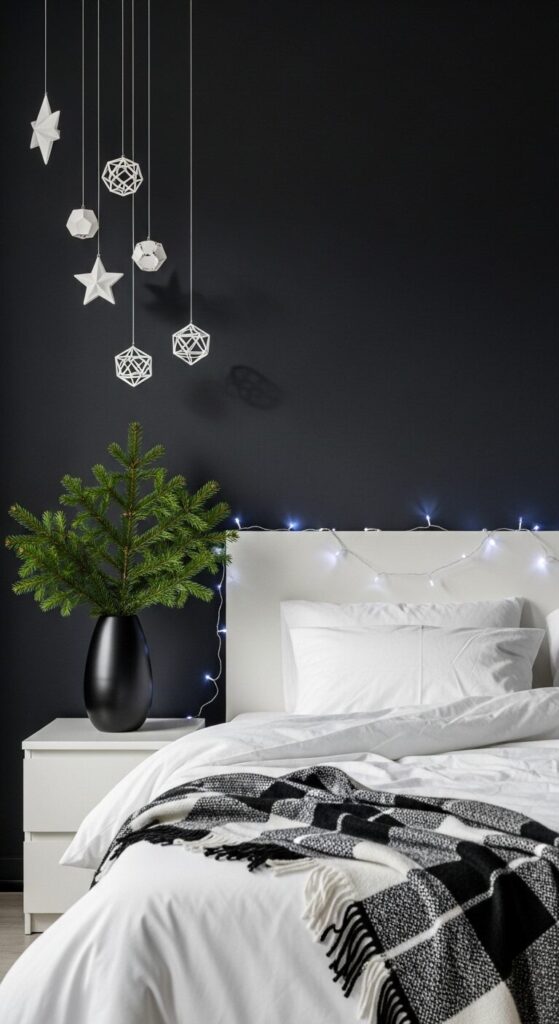 Picture a bedroom stripped to essentials—crisp white bedding against dark walls, with just whispers of Christmas throughout.
