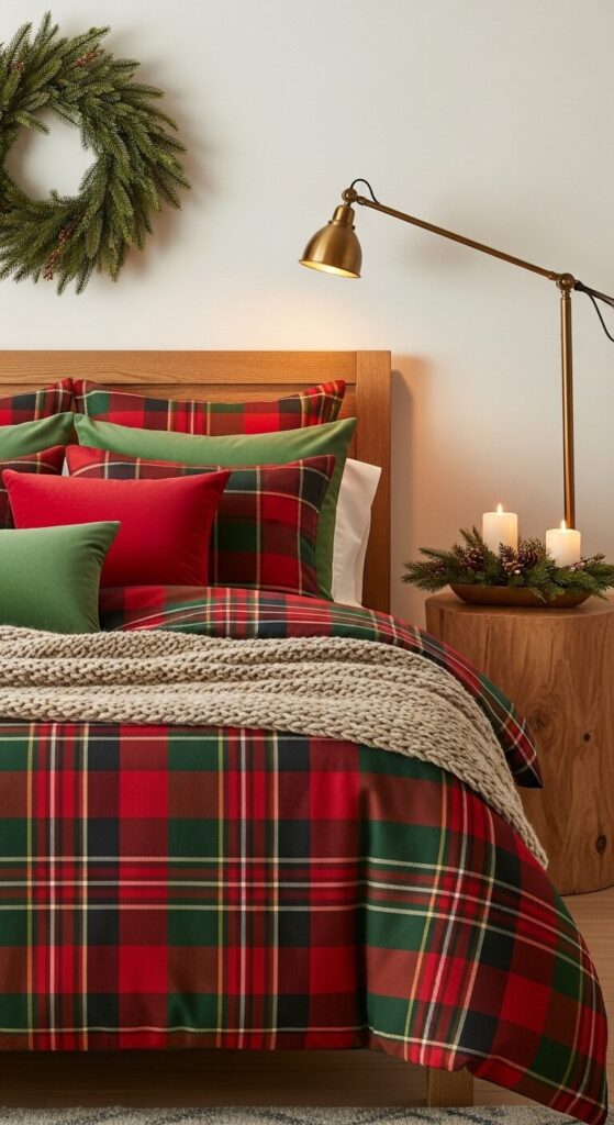 Imagine a bedroom wrapped in the timeless charm of red and green plaid bedding, with tartan throws draped casually across the foot of the bed.