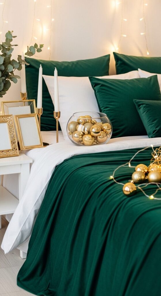 Think deep emerald green velvet pillows against crisp white sheets, with champagne gold accents catching the light. A luxe gold-framed mirror reflects the sparkle of metallic ornaments clustered in a glass bowl.