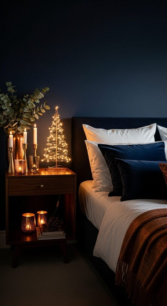 • Transform nightstands into mini vignettes with small trees, ornaments, and holiday-scented candles