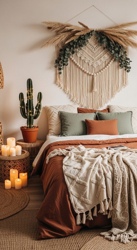 Imagine terracotta tones, warm creams, and dusty sage green coming together in a bedroom that feels earthy and free-spirited. Macramé hangs above the bed with dried pampas grass and eucalyptus woven through it.