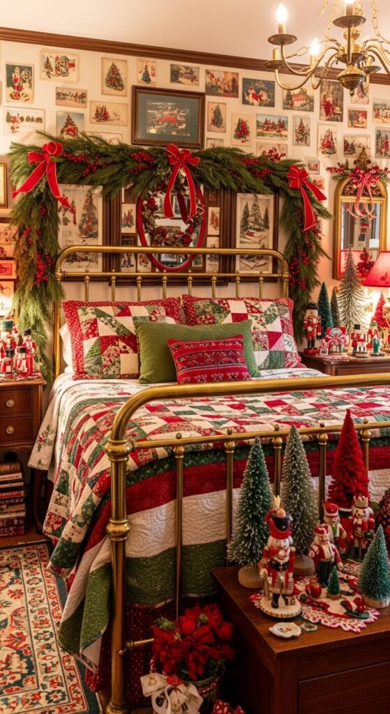 A garland thick with pine, berries, and ribbon swoops across the headboard. Vintage postcards and small wreaths hang on the walls, while the nightstand holds a collection of bottle brush trees, nutcrackers, and candles.