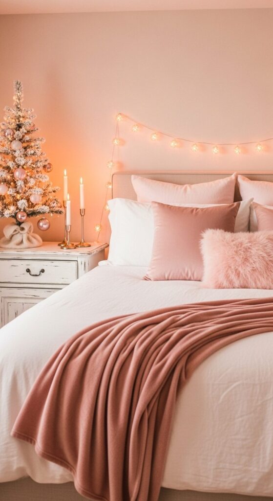 Rose gold string lights create a warm, romantic glow, and a small flocked Christmas tree in the corner is decorated with blush and gold ornaments. Everything feels feminine, gentle, and utterly romantic.