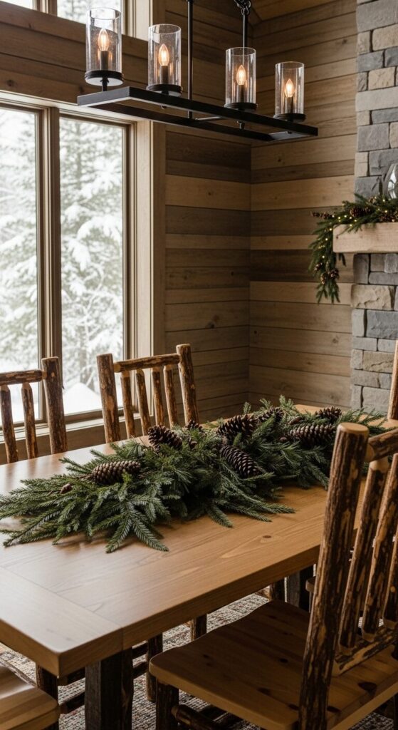A wooden table stretches across the room, laden with fresh pine boughs that spill over the edges like a forest floor.