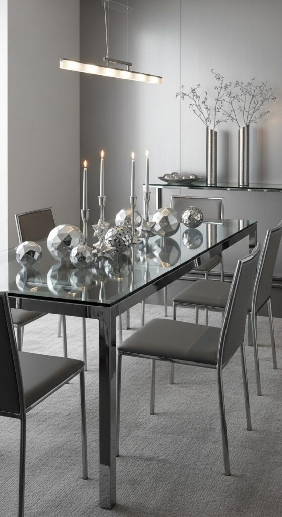Sleek lines define a glass tabletop scattered with silver spheres that gleam under overhead lights.