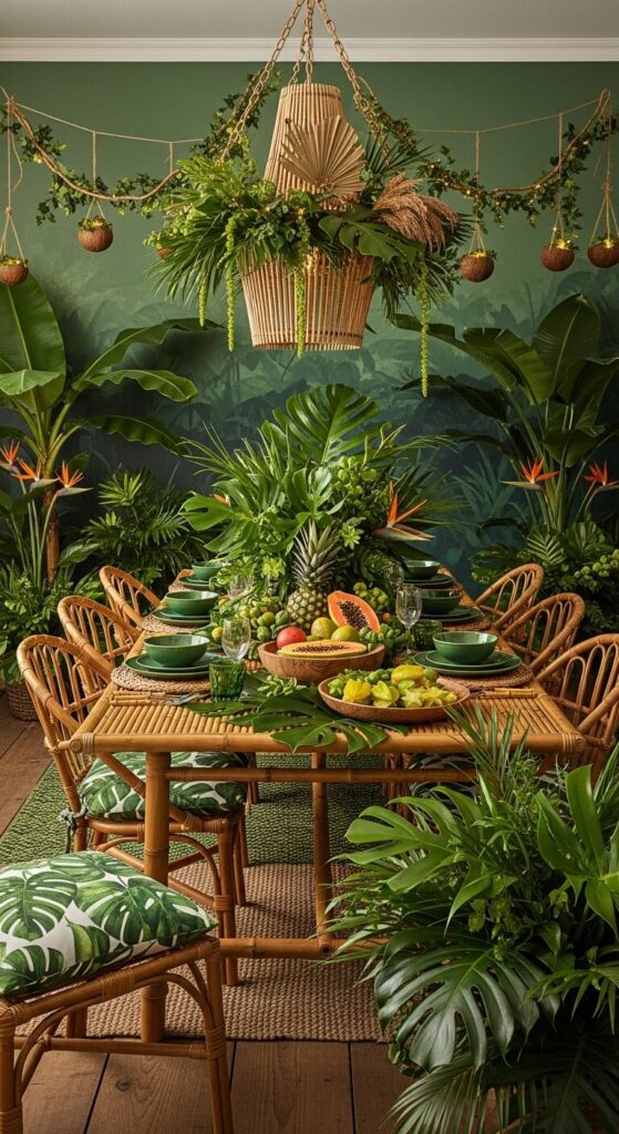 Bamboo elements and leafy prints in emerald tones fill every corner.