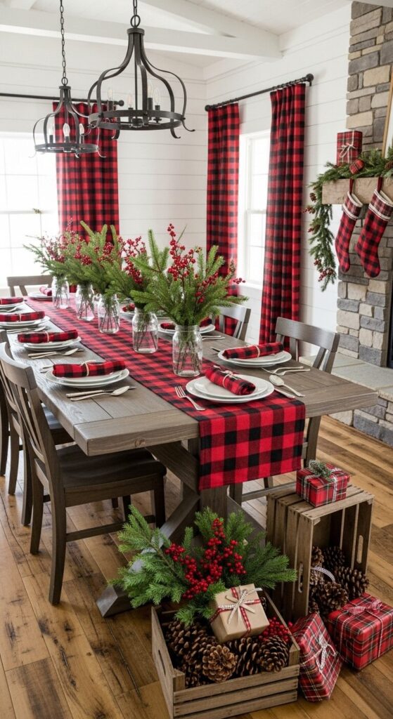 Deep green walls embrace a polished table covered in red plaid cloth, evoking old-fashioned holiday cheer.