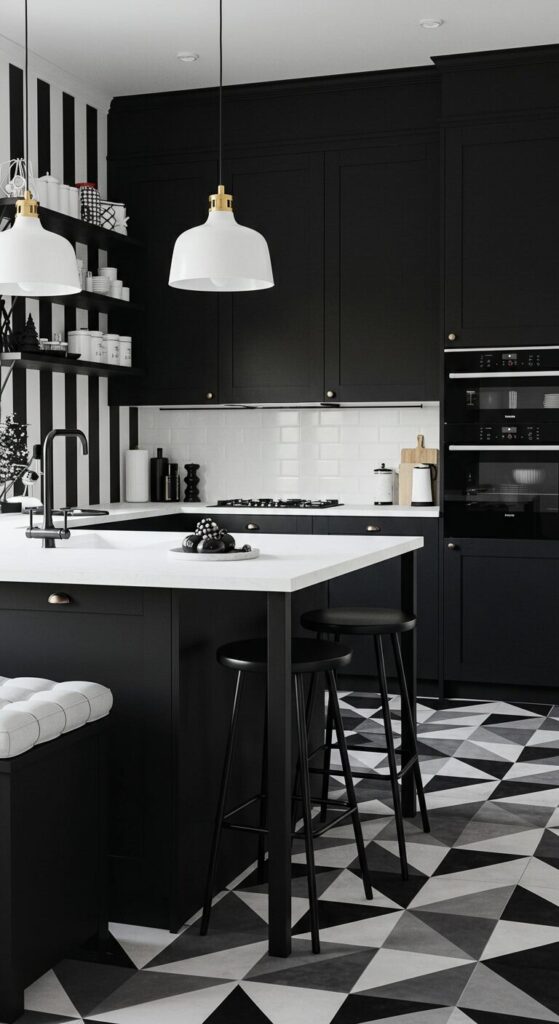 Black and white create bold modernity, making your kitchen a striking canvas where holiday details pop with graphic appeal. Clean contrasts define.