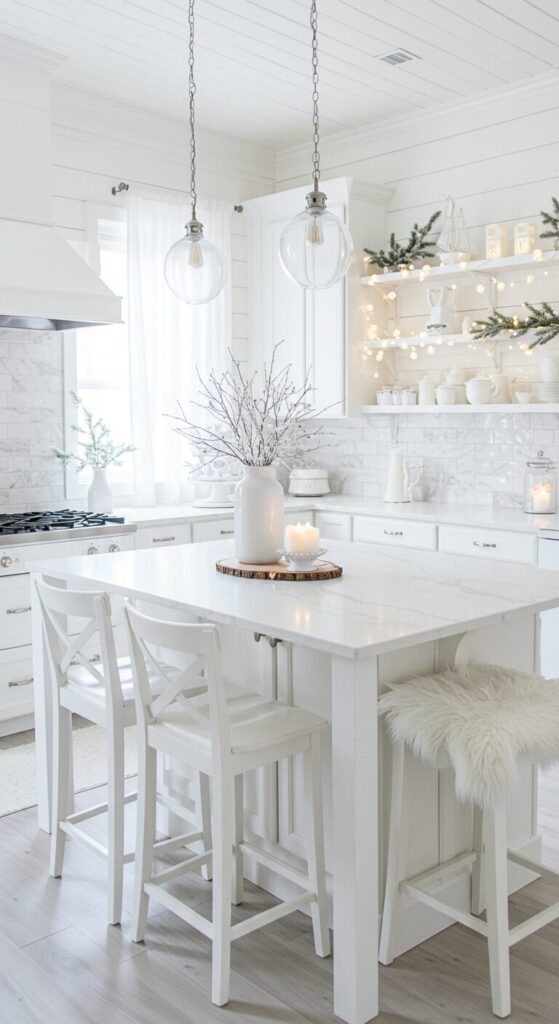 White layers evoke a peaceful winter escape, turning your kitchen into a tranquil spot where holiday prep feels calming and delightful. Soft textures in ivory shades soften the edges for ultimate comfort.