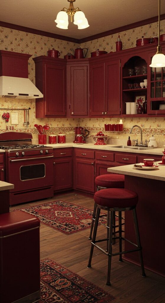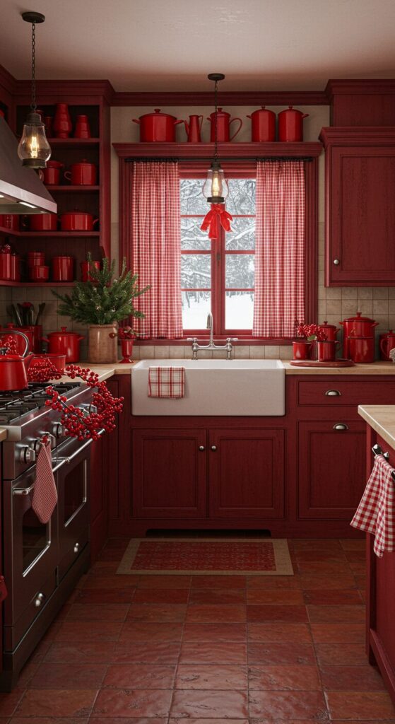 This dominant red theme shines through in every corner, from painted cabinets to patterned linens, making the room pulse with festive energy while staying effortlessly practical.