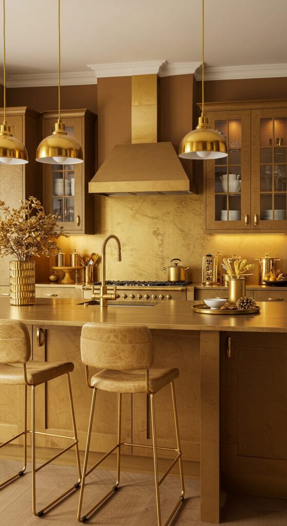 This pervasive gold theme unites the space, from hardware to surfaces, creating a radiant backdrop that feels both glamorous and welcoming for festive feasts.