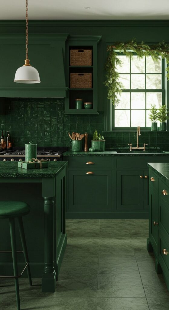 The overwhelming green dominance envelops every element, from cabinetry to textiles, crafting a serene retreat that invites relaxed holiday baking sessions.