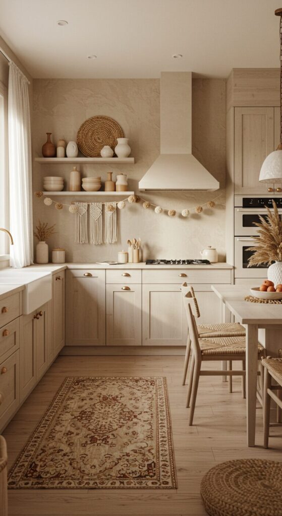 Neutral boho layers create a relaxed sanctuary, where eclectic textures blend for a kitchen that feels effortlessly artistic and holiday-ready. Natural materials ground the space.