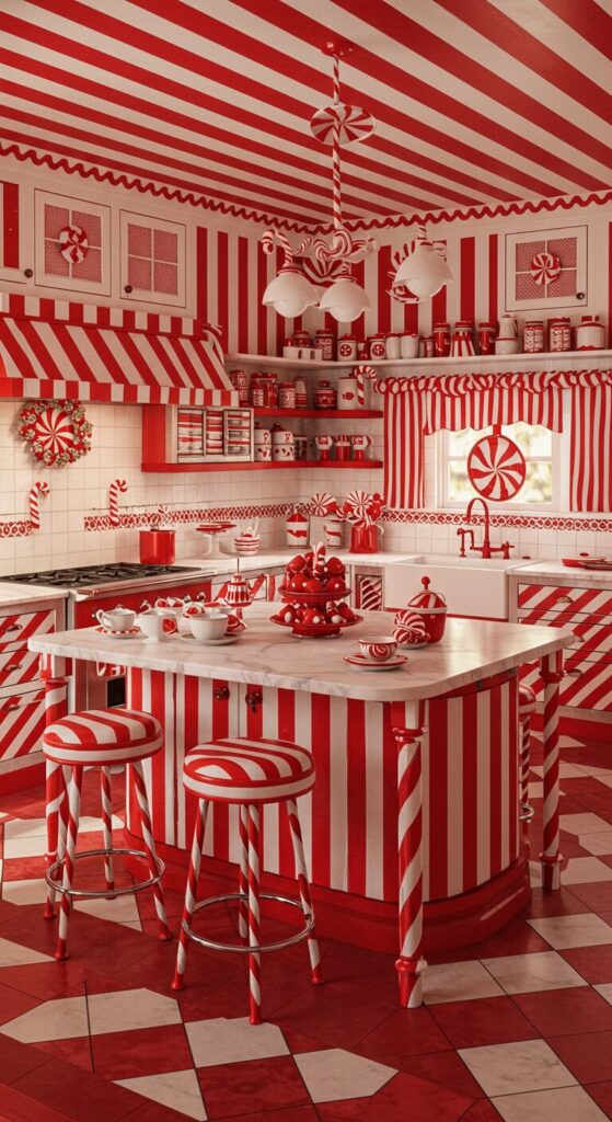 11. Whimsical Candy Cane Christmas Kitchen
