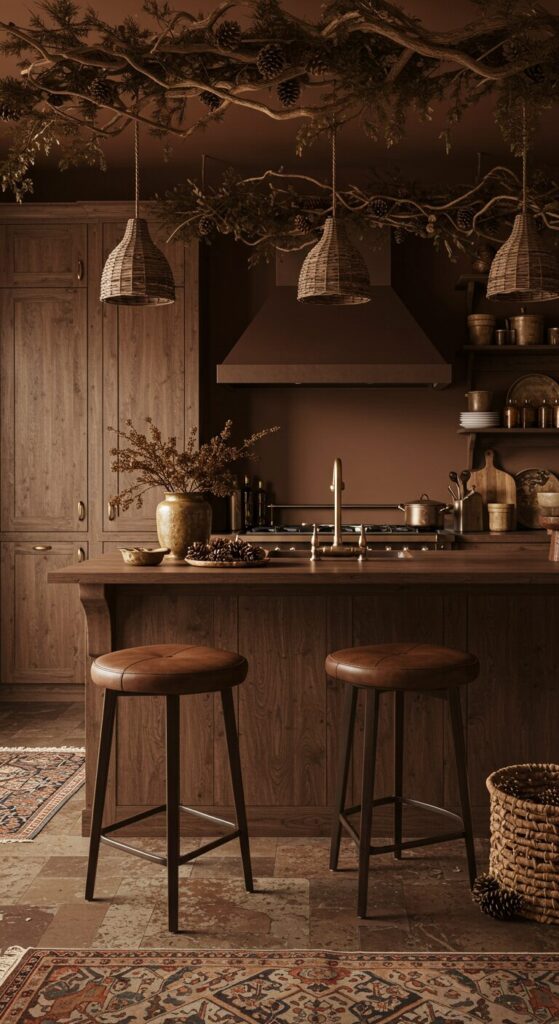 Brown shades mimic a cozy woodland, infusing your kitchen with grounded warmth that feels like a holiday nestled in nature. Textured woods invite touch.