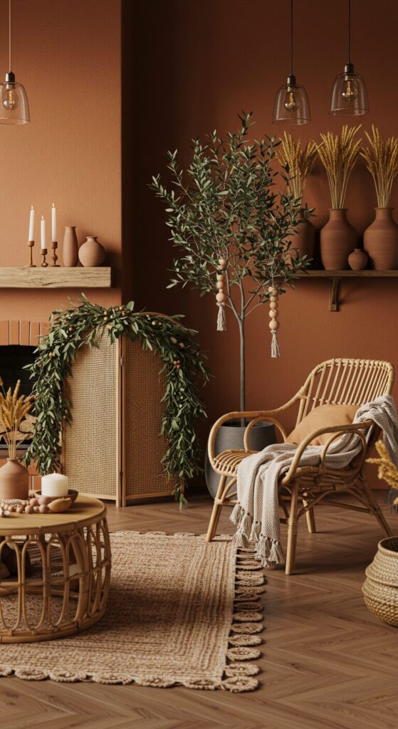 Wicker baskets brim with pinecones, paired with linen curtains and feather dreamcatchers.