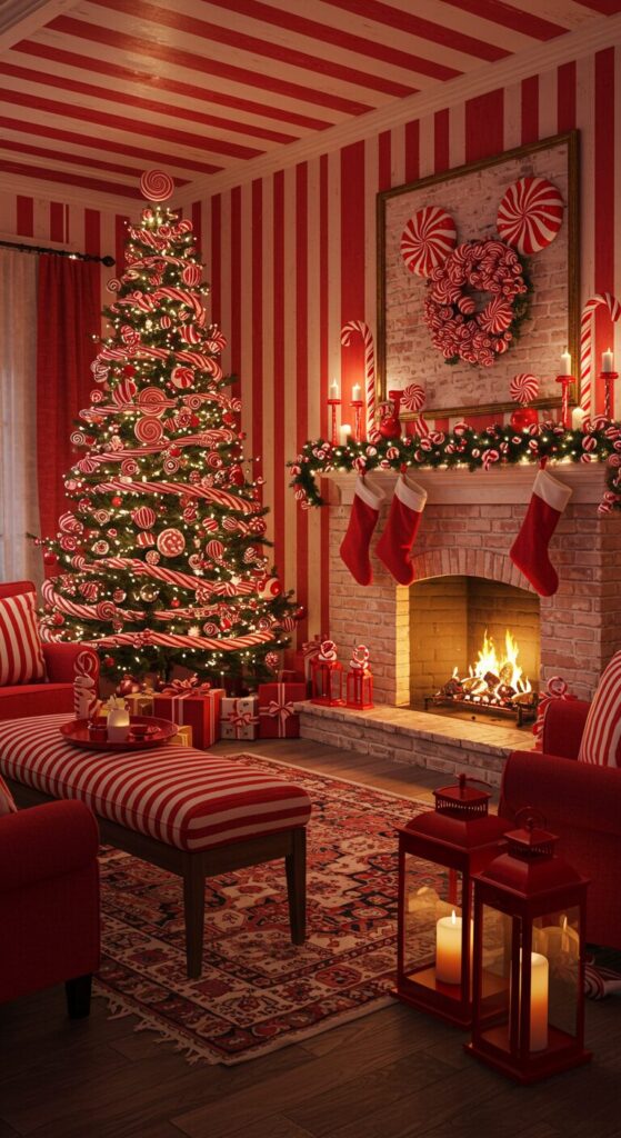 Striped stockings dangle merrily, inviting a whimsical candy swirl.