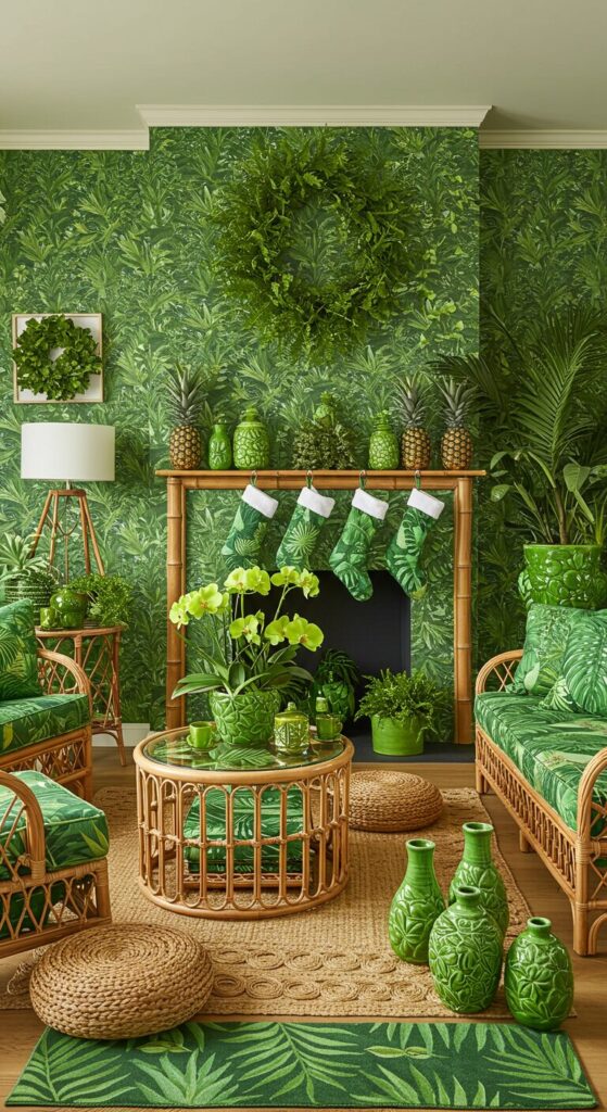 Bamboo lanterns and coconut shells hold vibrant green accents.