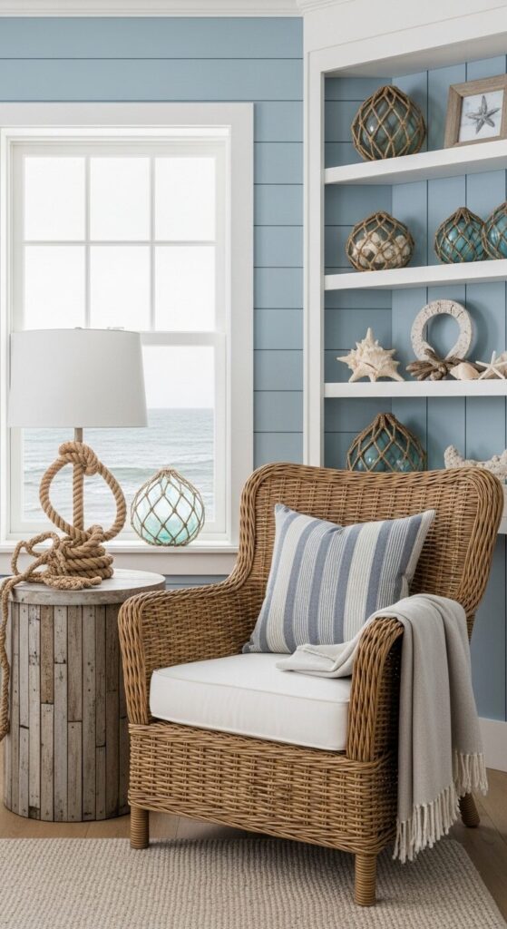 Driftwood shelves hold nautical treasures, complemented by linen pillows and a jute rug underfoot.