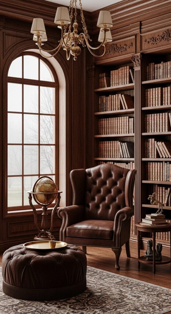 Antique leather-bound tomes line the walls, accented by brass lamps and faded Persian rugs.
