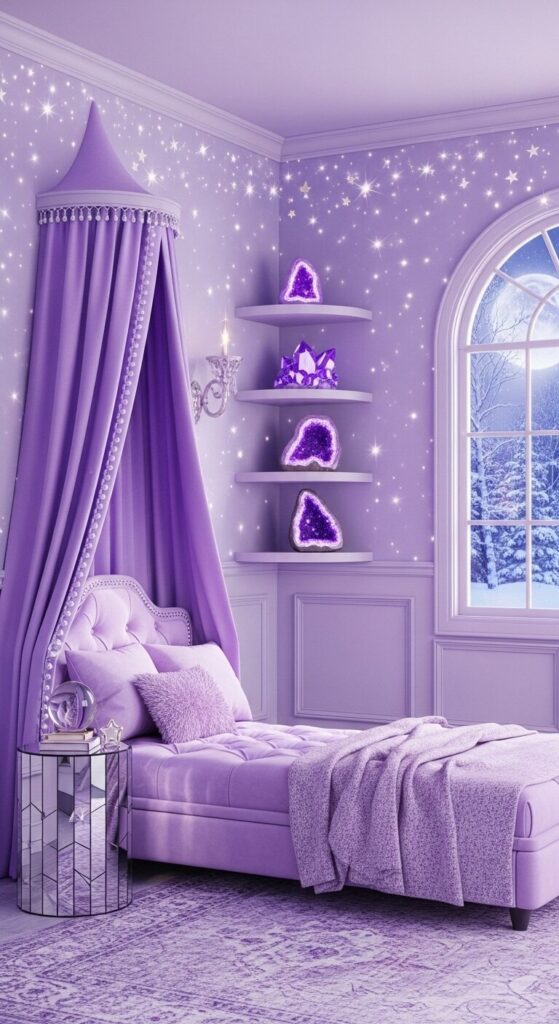 Beneath a draped canopy in a lavender lair, this nook sparks imagination with its enchanting allure.
