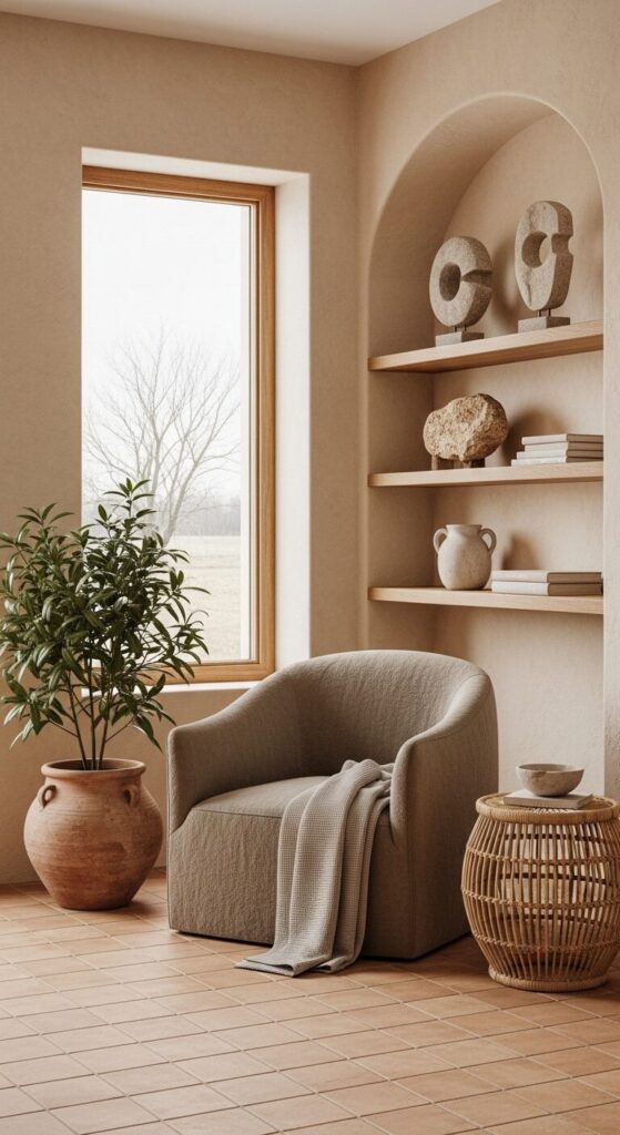 Amid soft beige expanses in a sun-warmed spot, this nook grounds you with its earthy palette.