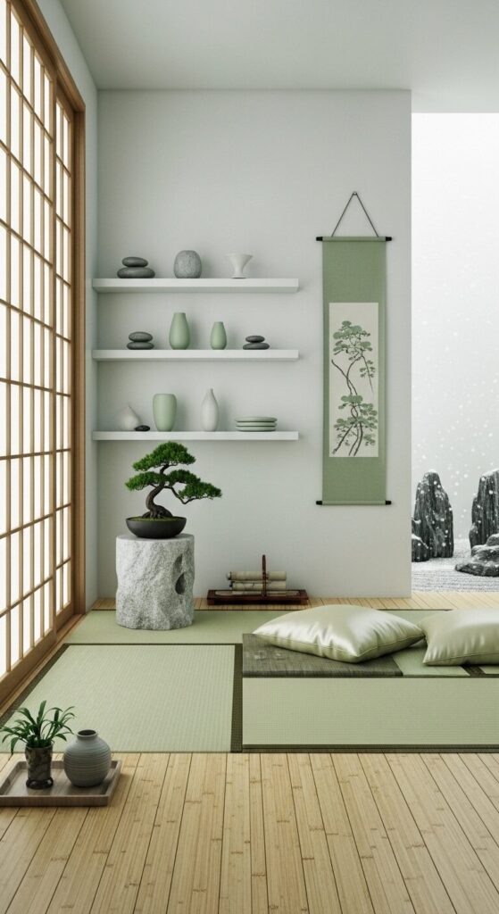 In a minimalist alcove with sliding screens, this nook offers zen tranquility amid winter’s stillness.