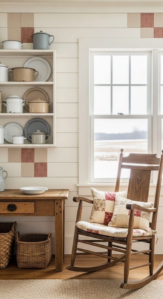 By a checkered window in a quaint space, this nook embodies heartfelt farmhouse simplicity.