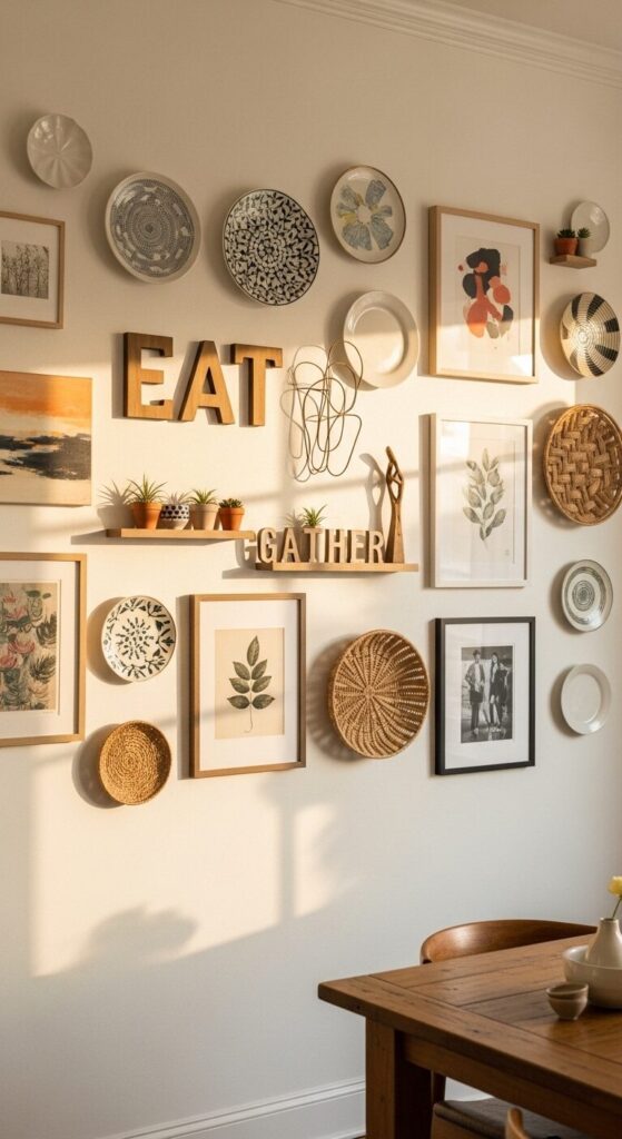 Step beyond flat art with a wall that incorporates sculptural elements—ceramic plates, wooden letters, small shelves, and metal wall sculptures. The play of shadows and depth creates visual interest that changes with the light throughout the day.