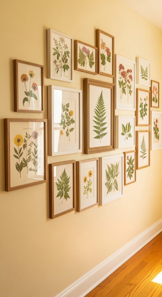 Lush greenery comes to life through pressed plants, botanical illustrations, and framed leaf prints on a soft butter-yellow wall. Vintage-style botanical drawings mix with modern photography of ferns and monstera leaves, creating a garden that never needs watering.