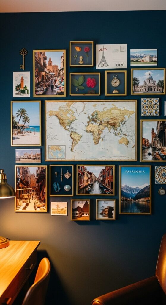 Include a large world map as your central piece, then build outward. Update seasonally by rotating in photos from recent trips to keep the display fresh and meaningful.