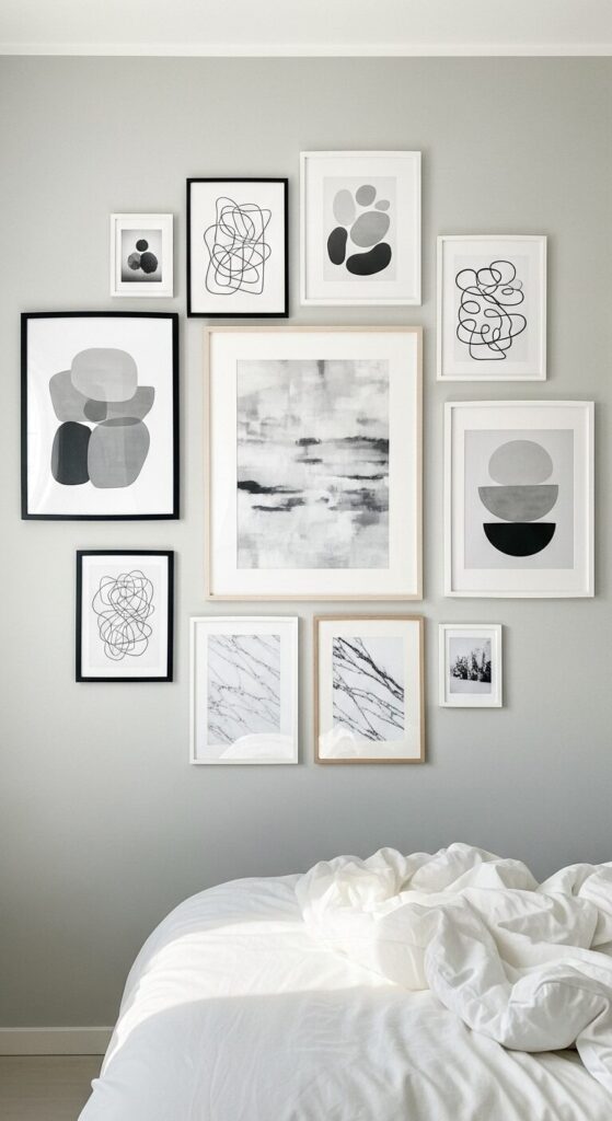 Shades of gray, white, and black create a sophisticated gallery wall that feels calming yet interesting. Abstract paintings, line drawings, marble prints, and minimalist photography all work within this restrained palette.
