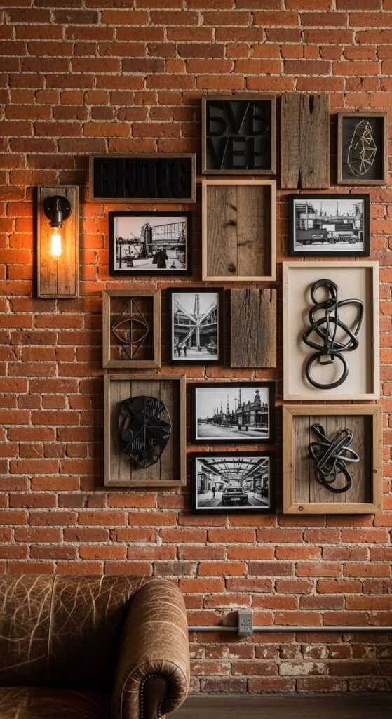 Raw wood frames, metal wall art, and black-and-white photography combine on an exposed brick wall for urban loft appeal. Weathered wood pieces with visible grain sit next to sleek metal typography and vintage industrial prints.