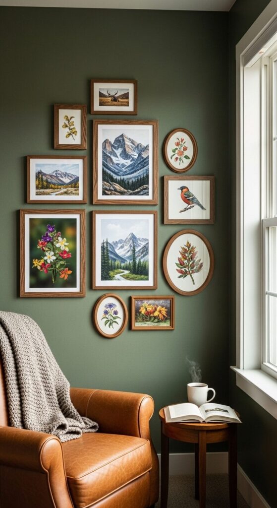 Wildlife photography, nature prints, and landscape paintings bring the great outdoors inside on a forest green wall. Majestic mountain ranges, intimate bird portraits, and macro shots of flowers create a nature lover’s paradise.