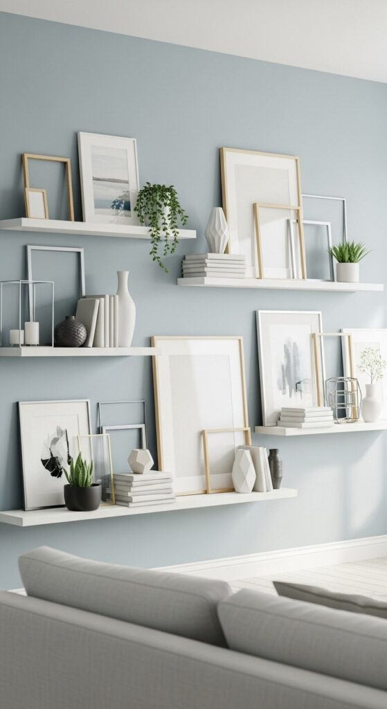Style Tip: Install shelves first, spacing them irregularly rather than in straight lines. Keep shelf styling minimal—2-3 small items per shelf maximum. Choose objects that complement your artwork’s color palette.