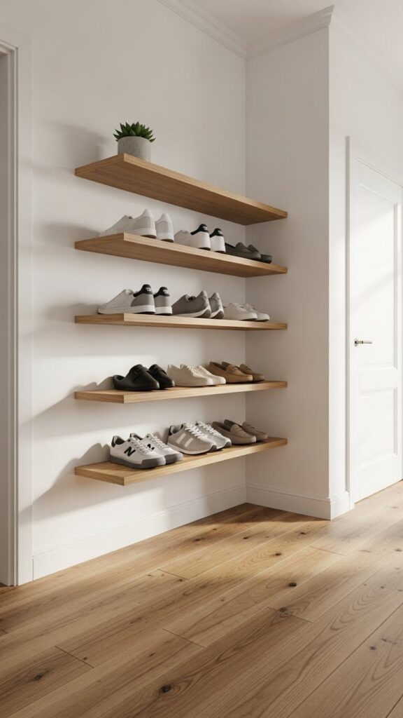 - Floating shelves create airy, minimalist shoe displays perfect for small spaces