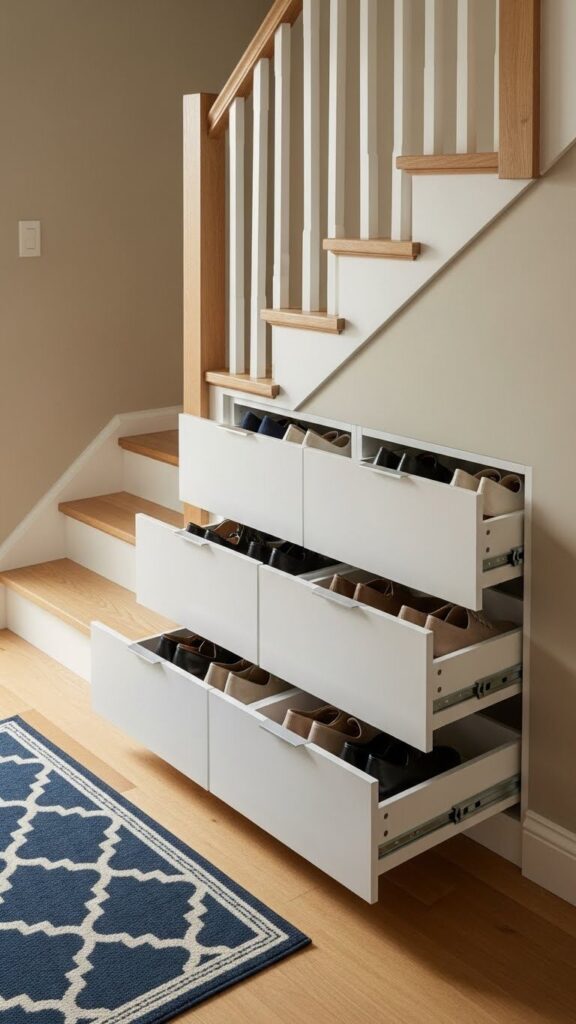 The space beneath your stairs is often wasted, but it’s actually prime real estate for shoe storage. Custom pull-out drawers tucked into each step create a surprisingly spacious solution that completely disappears from view.
