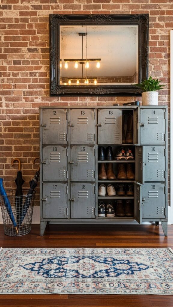 There’s something wonderfully nostalgic about old school lockers repurposed as shoe storage. The metal patina, the numbered doors, the satisfying click when they close—it all adds instant character.