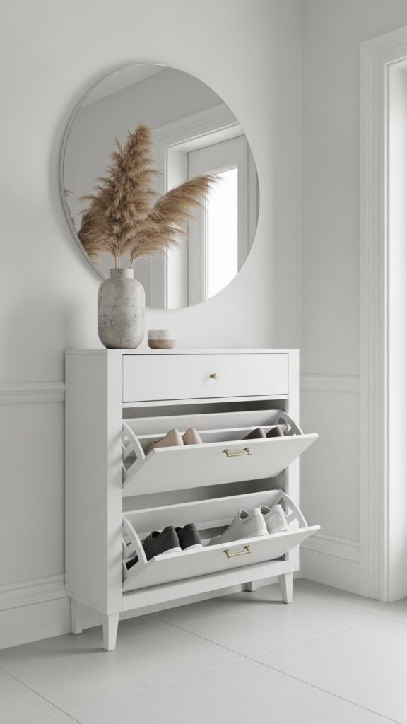 A narrow console that looks like elegant furniture but secretly houses your entire shoe collection—that’s the magic of tilt-out shoe cabinets. The facade remains sleek and uncluttered while shoes hide neatly behind.