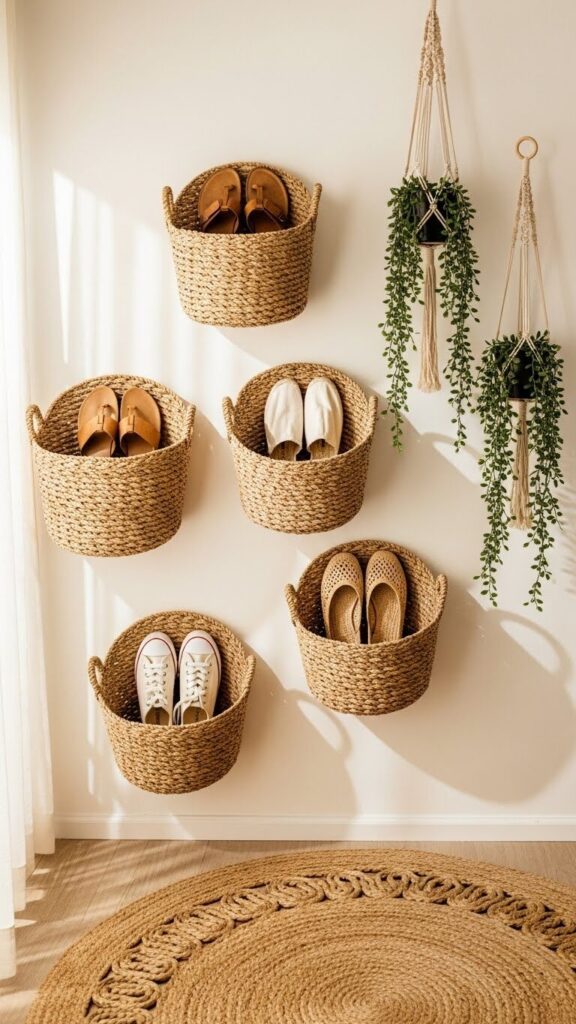 Imagine a collection of natural woven baskets mounted on your wall, each one cradling shoes in organic, textured style. The neutral tones and handcrafted feel bring instant warmth to any entryway.