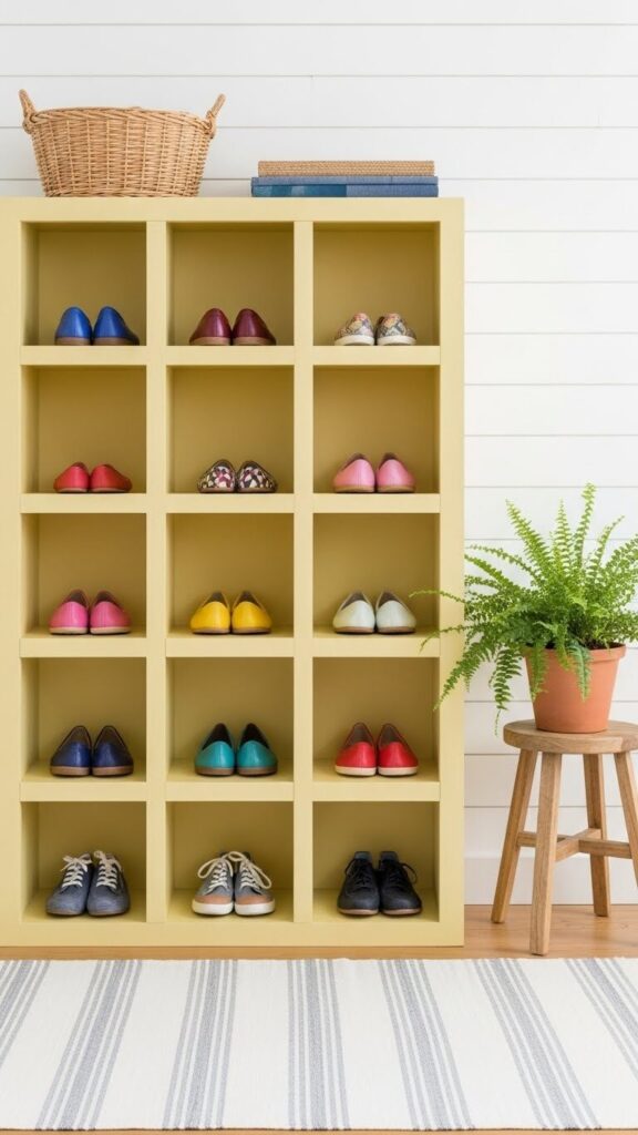Picture a cheerful grid of open cubbies, each square perfectly sized for one pair of shoes. Painted in a soft, happy hue, it turns shoe storage into a focal point rather than something to hide.