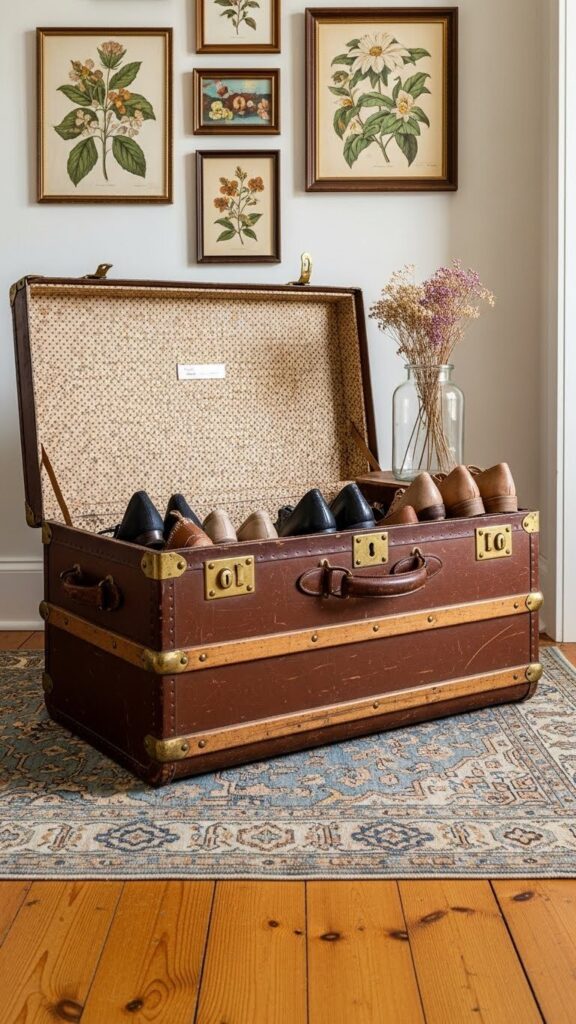 Vintage trunks work beautifully in traditional, eclectic, or travel-inspired interiors where character pieces are celebrated. The closed lid keeps shoes hidden and provides a surface for decorative objects.