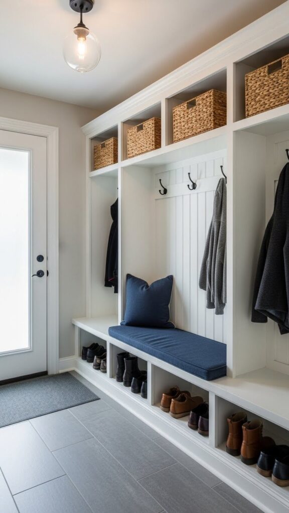 Imagine a dedicated mudroom nook where everything has its place—a comfortable bench for sitting, open shelves below for shoes, and hooks above for coats. It’s an entryway command center that keeps chaos at bay.
