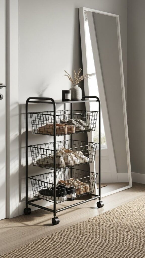 A slim rolling cart brings mobility to shoe storage—wheel it to where you need it, then tuck it away when company arrives. The tiered design maximizes vertical space without occupying much floor area.