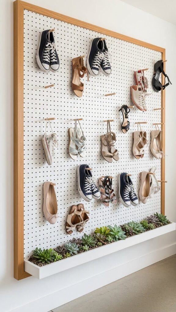 A pegboard wall transforms shoe storage into an art installation. Wooden pegs hold shoes by their heels and straps, creating a dynamic, three-dimensional display that’s endlessly reconfigurable.