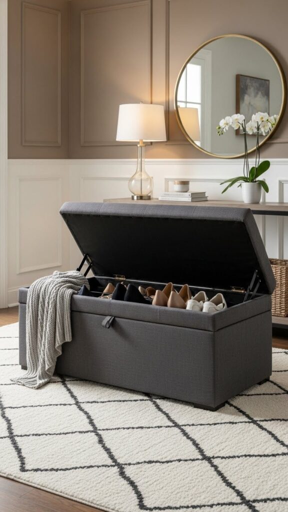 Bring This Style Home: Add a wooden tray on top to create a stable surface for keys or a decorative vignette. Consider ottomans with interior dividers to keep shoes organized rather than jumbled together in a pile.