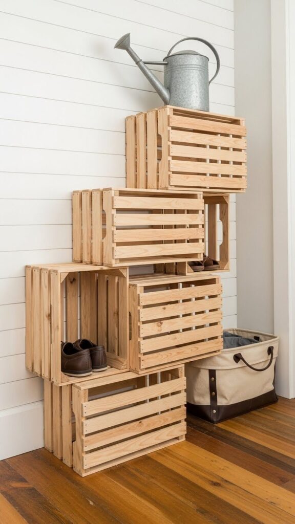 Weathered wooden crates stack in an artful arrangement, each one turned to create an open cubby for shoes. The rustic wood grain and rough edges bring farmhouse charm to functional storage.