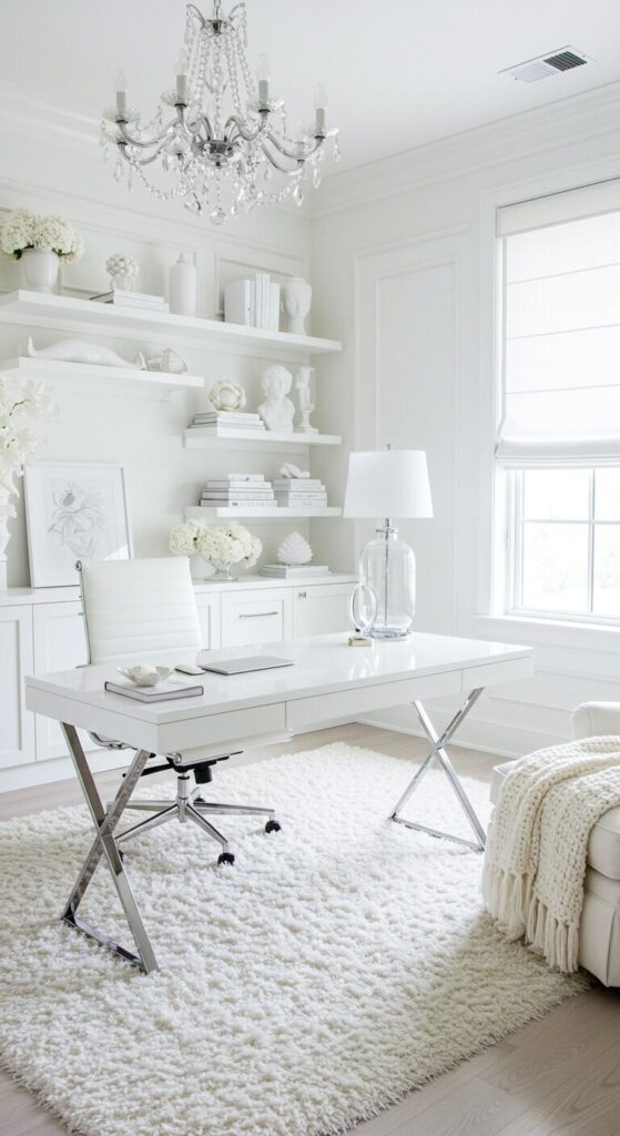 An all-white office creates a clean canvas that promotes focus and mental clarity.